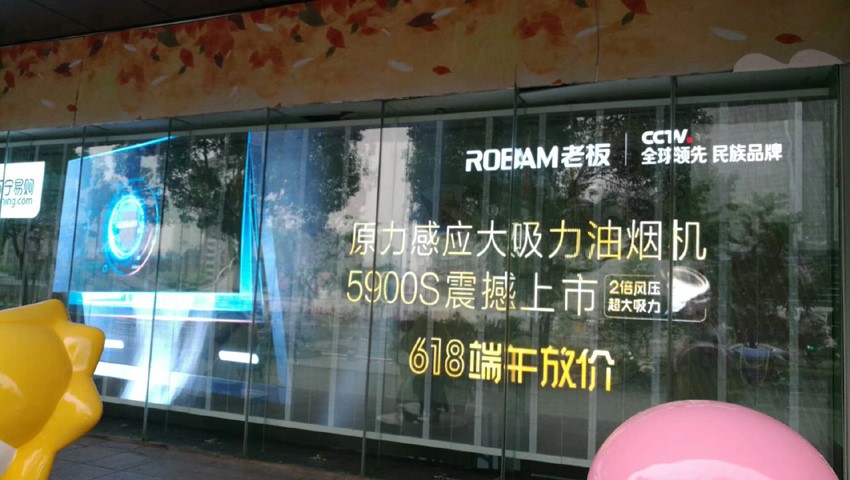 2018年5月,我公司與蘇寧云商集團股份有限公司合作,安裝完成蘇寧生活廣場上海五角場試點一塊面積30平方米的P3.9*7.8規格的LED透明屏。
